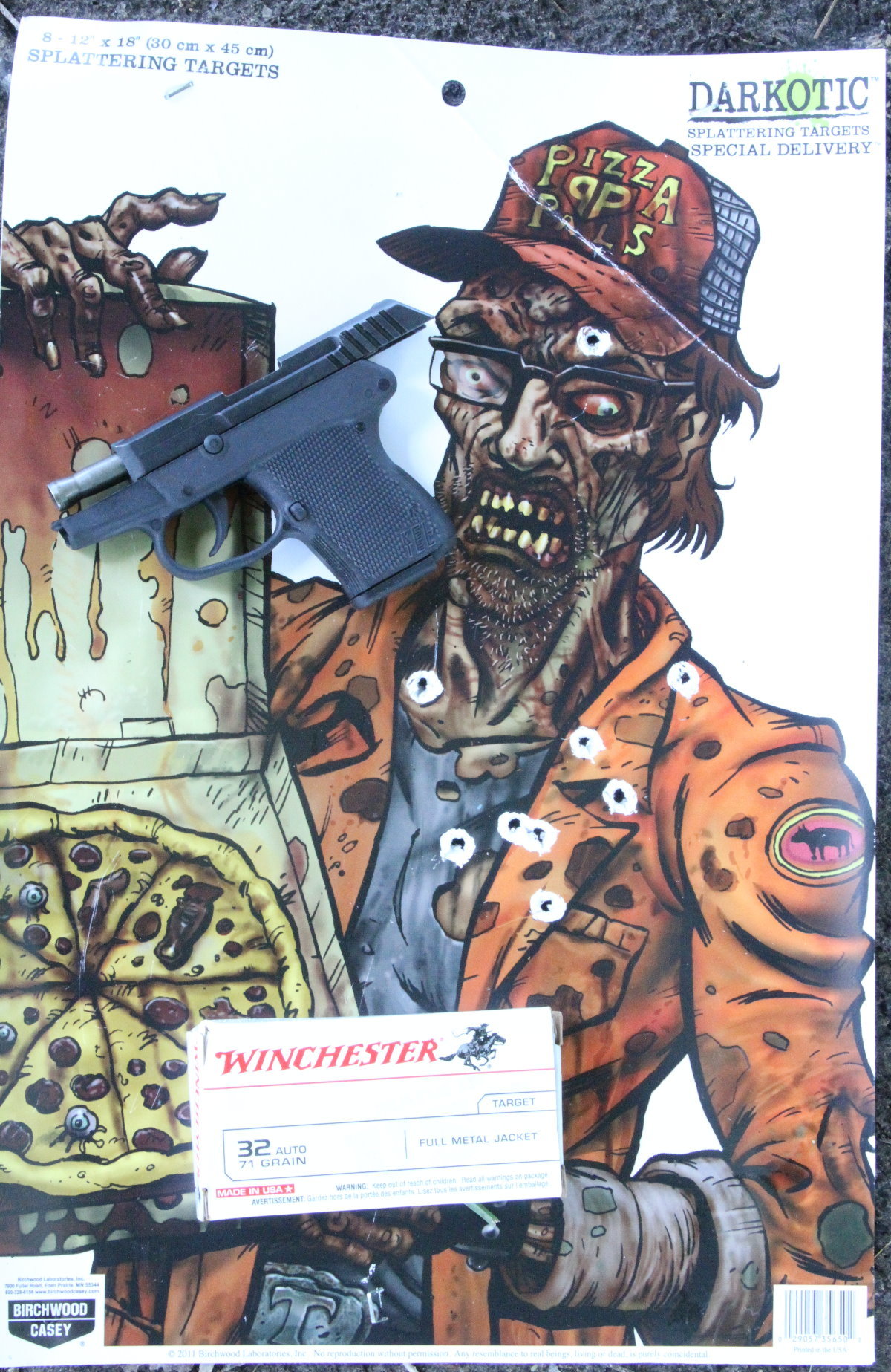 The performance of the P-32 is actually pretty good considering that you can find them at street prices in the mid $200s. I shot two boxes through this review gun and had no failures at all. At 10 yards, my "across the living room" distance, I was able to easily keep the whole magazine inside what would be chest shots. Aimed and held with two hands, with a slow trigger pull, again offhand, I was able to cap the forehead shot on the zombie target you see here very easily. The P-32 is accurate enough for self defense. It is an inexpensive gun, not a cheap gun. There is a huge difference.